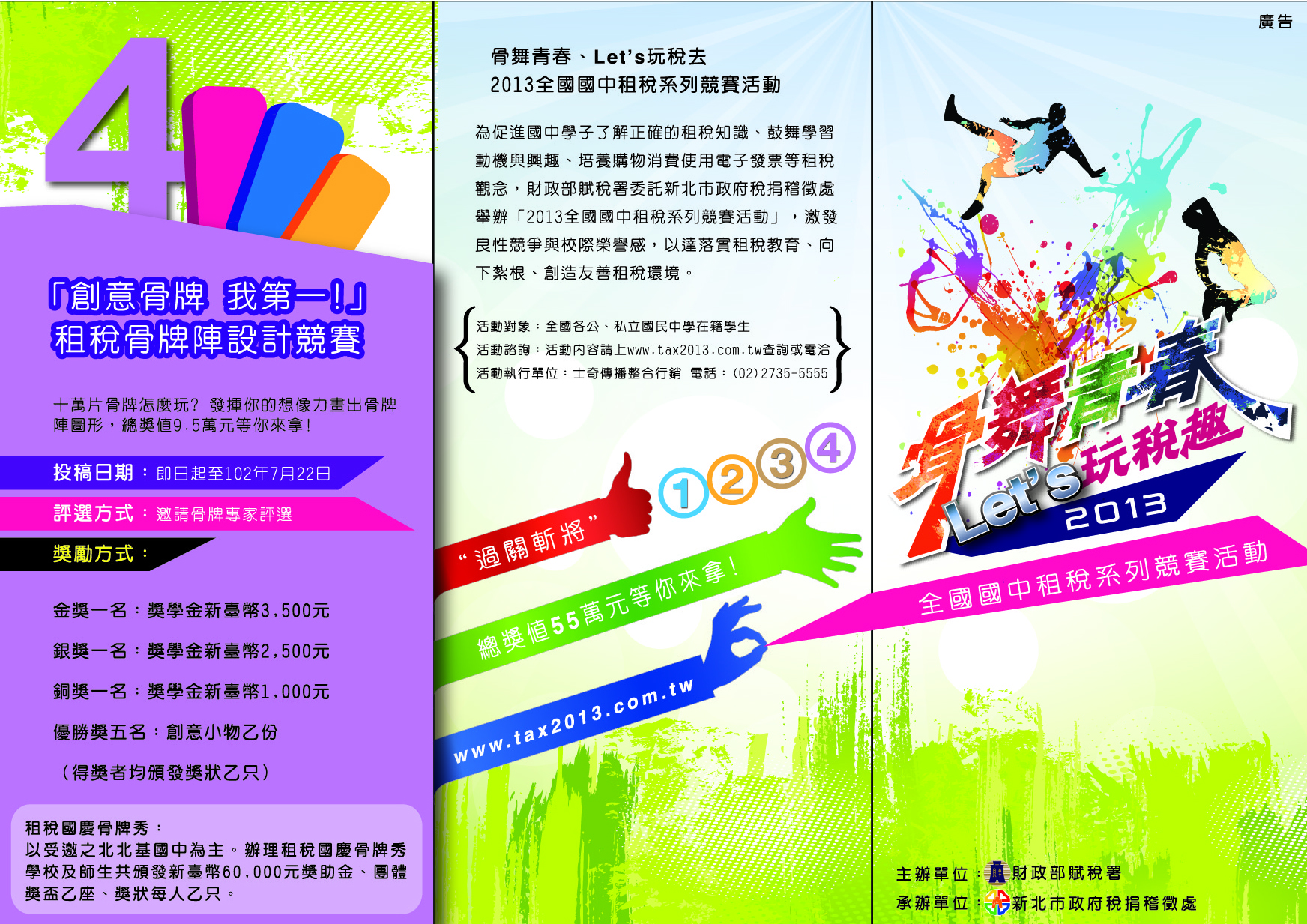 說明: 一、依據新北市政府稅捐稽徵處102年6月6日北稅企字第1023059525號函辦理。 二、為培育莘莘學子正確的納稅觀念,藉由全國性整合傳播行銷,建構專業性、創新性之宣導活動,有效的推廣購物消費使用電子發票及相關稅務訊息,並配合多元媒體通路鋪陳租稅教育網路,以期拓展廣度、強化深度,突顯「租稅」多元化面貌,提升學子對租稅的認知,以落實租稅教育紮根校園之目的。 三、旨揭活動擬訂執行內容包含「租稅Gwiyomi手指舞人氣選拔賽」、「租稅吉祥物設計比賽」、「租稅舞林大賽」、「租稅骨牌設計競賽及租稅國慶骨牌秀」四項活動(如附件),請各國民中學學生踴躍報名參加。