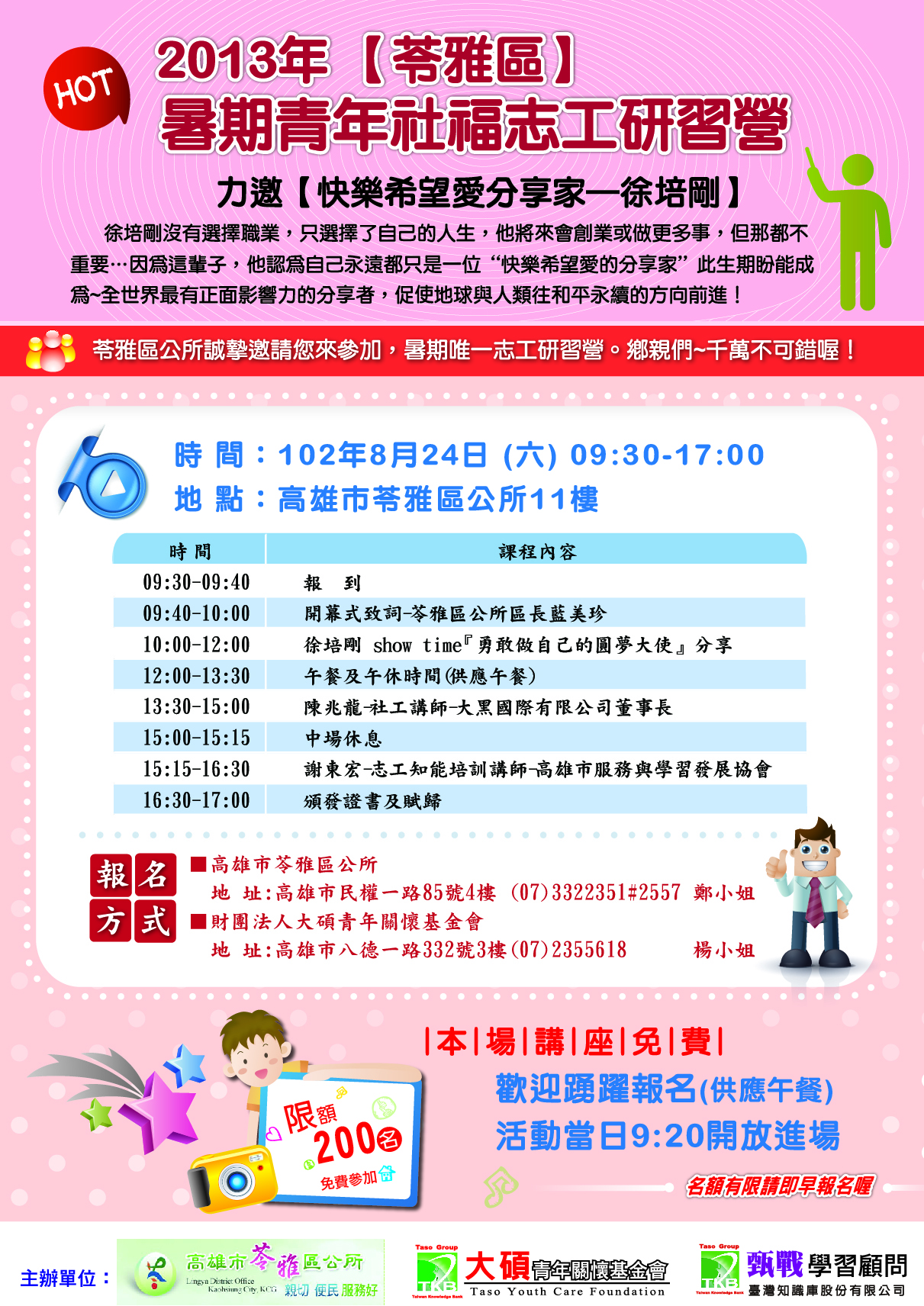 高雄市苓雅區公所8月24日(六)舉辦暑期青少年志工研習營,歡迎同學踴躍報名參加