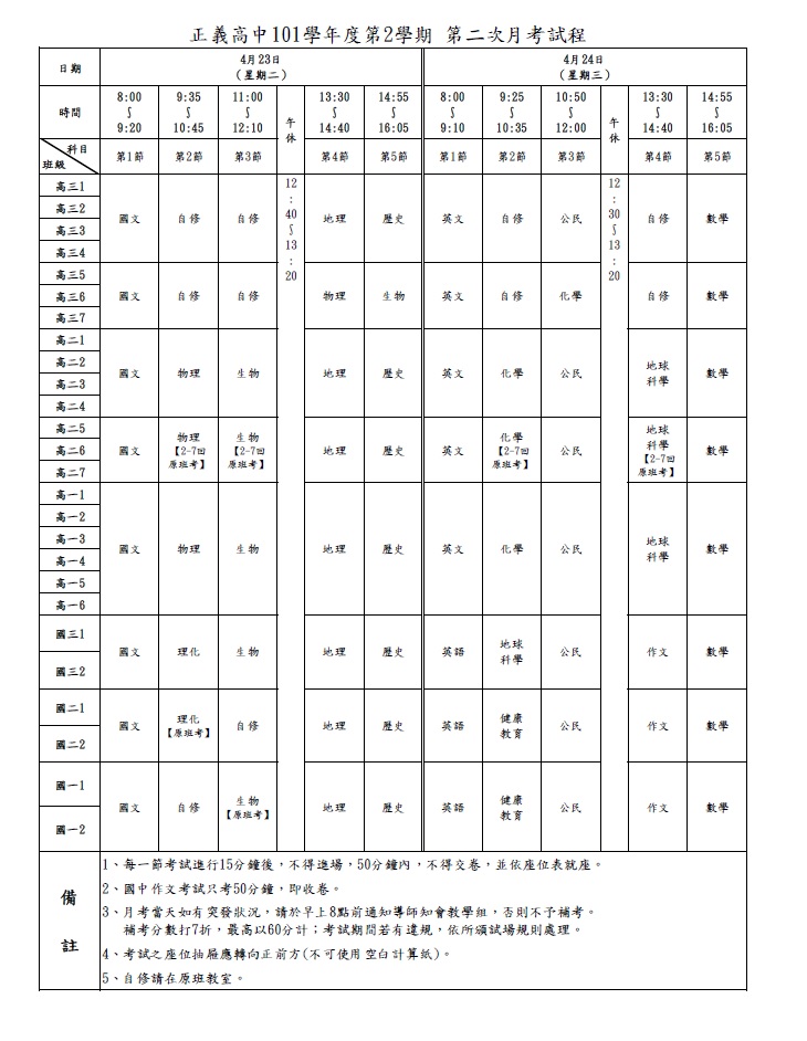 101學年度第2學期 第二次月考 試程表